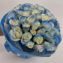 На фото букет из 41 голубой розы. В составе: роза 41 шт, дизайнерская упаковка 1 шт, атласная лента 1 шт, . Все цветы свежие и ароматные, букет красиво оформлен и отлично подходит для подарка. Доступна доставка цветов или самовывоз.