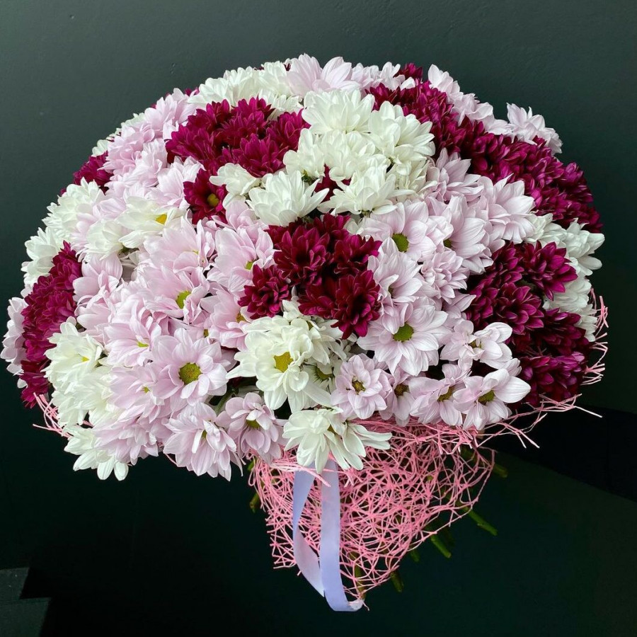 На фото букет из 35 розовых хризантем. В составе: хризантема кустовая 35 шт, . Все цветы свежие и ароматные, букет красиво оформлен и отлично подходит для подарка. Доступна доставка цветов или самовывоз.