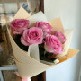 На фото букет из 5 розовых роз. В составе: роза 5 шт, крафт-бумага 1 шт, атласная лента 1 шт, . Все цветы свежие и ароматные, букет красиво оформлен и отлично подходит для подарка. Доступна доставка цветов или самовывоз.