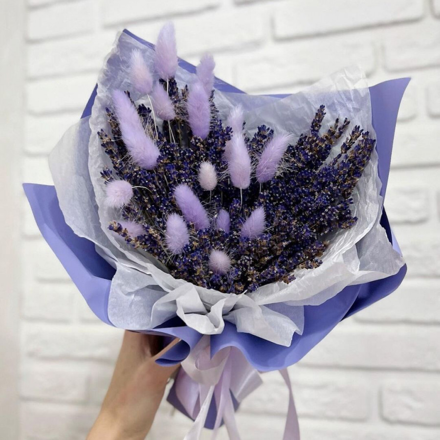 На фото букет из лаванды и лагуруса. В составе: лаванда 5 шт, лагарус 4 шт, колосья 2 шт, крафт-бумага 1 шт, вибирнум 1 шт, . Все цветы свежие и ароматные, букет красиво оформлен и отлично подходит для подарка. Доступна доставка цветов или самовывоз.