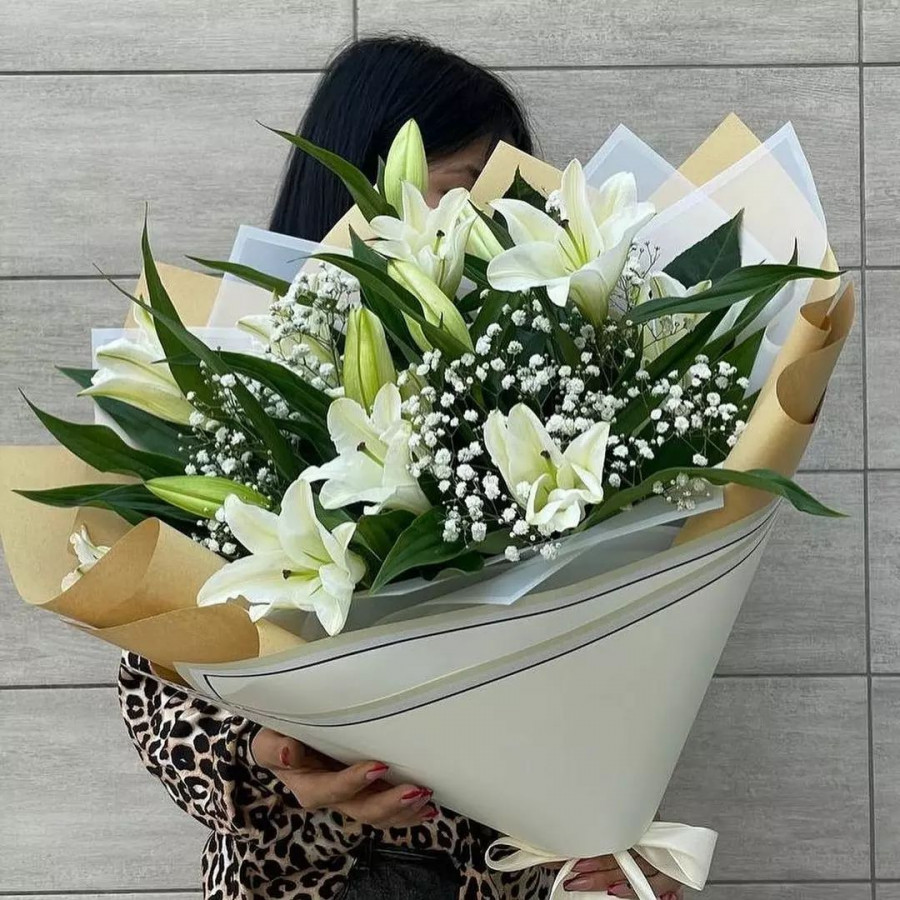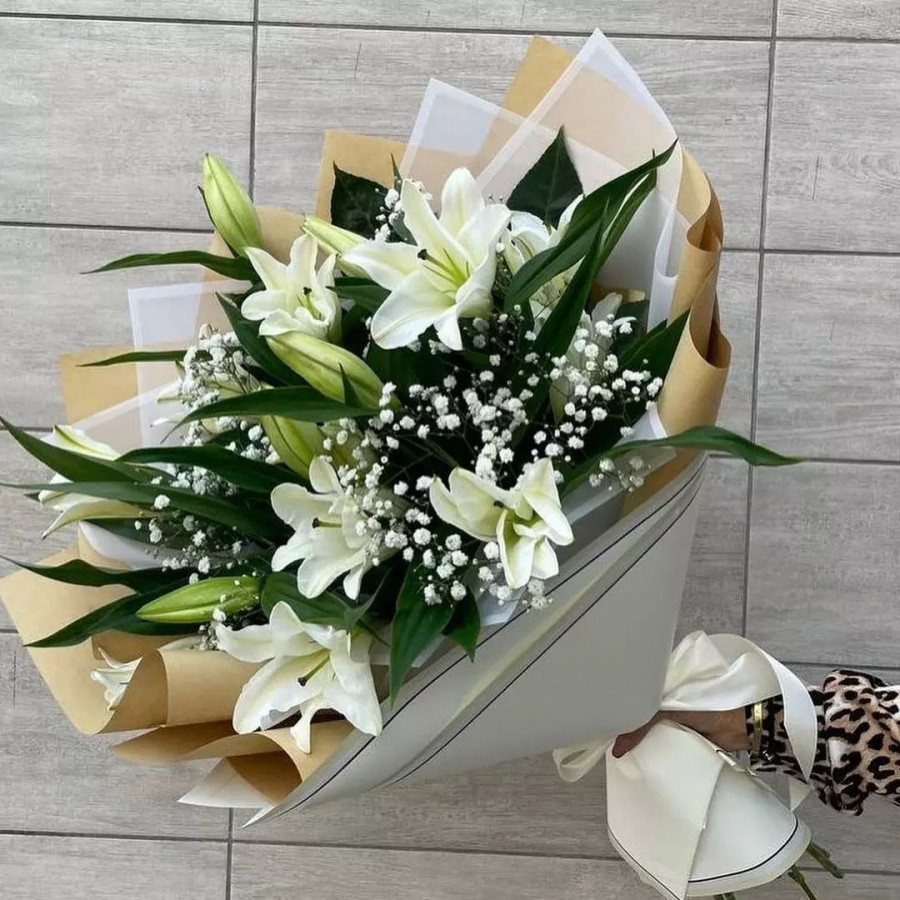 На фото букет из лилий и гипсофилы. В составе: лилия 5 шт, гипсофила 4 шт, крафт-бумага 1 шт, атласная лента 1 шт, . Все цветы свежие и ароматные, букет красиво оформлен и отлично подходит для подарка. Доступна доставка цветов или самовывоз.