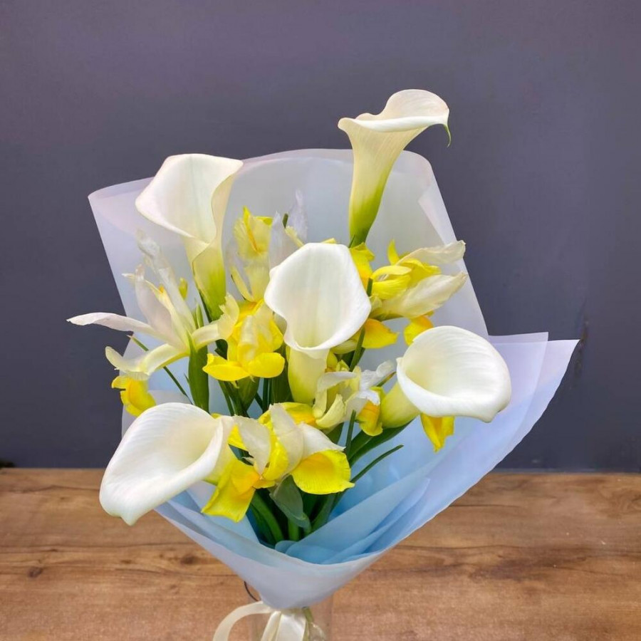 На фото букет из желтых ирисов и беллых калл. В составе: ирис 9 шт, калла 5 шт, дизайнерская упаковка 1 шт, атласная лента 1 шт, . Все цветы свежие и ароматные, букет красиво оформлен и отлично подходит для подарка. Доступна доставка цветов или самовывоз.